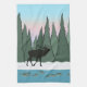 Escena de invierno estilizada y super fresca con una alce en silueta, peces nadando en el río, bosque evergreen y un hermoso cielo de madrugada o tarde. Por Melissa J Barrett