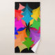 Este juego de toallas incluye una toalla de baño de diseño moderno de mediados de siglo con una corona de estrellas en tonos rojos, naranjas, amarillos, verdes, azules y morados, un paño de lavabo morado y una toalla de mano verde.