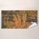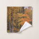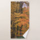 hojas de bonito caídas en naranja rojo y amarillo dorado en un bosque de altos tulipanes, palmeras y arbustos verdes. El cielo azul asomando. Feliz otoño, la belleza de la naturaleza, las hojas de otoño están escritas en escritura amarilla y naranja. Fotografía original © TamiraZDesigns.