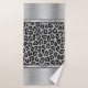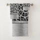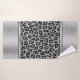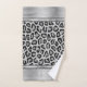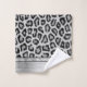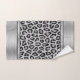 Una exótica toalla de impresión de leopardo de piel en negro y plateado, con un brillante cobertizo metálico plateado en el borde de las toallas para el contraste. Las vibraciones de moda animal de glam.