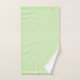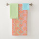 Este juego de toallas incluye un lavabo azul claro, una toalla de mano verde claro y una toalla de baño con un diseño de Pascua de círculos divididos en líneas verdes, azules y moradas sobre un campo de naranja.