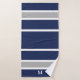 Haz una declaración con este atrevido juego de toallas de baño a rayas azules, blancas y grises. Tanto la toalla de mano como la toalla de baño tienen tu monograma en blanco en la parte inferior. Especialmente apropiado para un hombre, pero atractivo en cualquier baño.