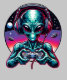 Alien jugando videojuegos con auriculares y controlador en la mano. El arte alienígena colorido.