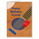 Una tarjeta de cumpleaños para un primo que ama la guitarra. Un primer plano de una guitarra con un plectrum colgado en las cuerdas. En el plectrum están las palabras 'You Rock'. Una tarjeta de cumpleaños para un músico que ama la guitarra.
