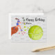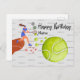 Mujer jugadora de tenis jugando tenis con muchas pelotas de tenis en gráfico de texto para tarjeta de cumpleaños