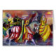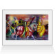 Elegante, caprichosa, pintura artística con música musical mágica y colorida nocturna, luna, faeries, caballos de vivos colores azul verde, rojo, amarillo, blanco. Pintura acrílica sobre lienzo, pintura de medios mixtos con Relieve metalizado dorado y plateado.