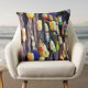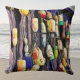 Esta almohada ofrece una vista estilizada de las boyas de pesca en un edificio rústico para añadir encanto marinero a su decoración.