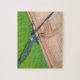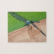 La pintura de una libélula azul sentada sobre una barandilla de madera, disfrutando del sol, está impresa en rompecabezas de rompecabezas. Los niños y los adultos podrán disfrutar de esta divertida actividad.
