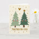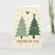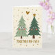 Esta adorable tarjeta de Navidad es imprescindible para difundir la alegría de las fiestas! 🎅🏼 El diseño principal cuenta con dos adorables árboles de Navidad, uno verde claro y otro verde oscuro, con sonrisas radiantes en sus rostros. 🎄 Un corazón dorado flota entre ellos, simbolizando el amor duradero. El juego de palabras "TOGETHER FIR-EVER" está elegantemente escrito debajo en una fuente marrón acogedora, agregando un toque de calidez al diseño. El fondo claro y los puntos dorados flotantes crean un ambiente festivo e invitador para tu mensaje de amor y compromiso. 🎁 Perfecta para tu novio, novia, esposo o esposa, esta tarjeta seguramente traerá una sonrisa a su rostro esta temporada navideña.