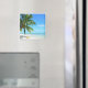 imán de recuerdo con un kayak amarillo bajo una palmera colgante en una playa de arena blanca en la isla tropical de Moorea, cerca de Tahití, en el archipiélago del Pacífico Polinesia Francesa.