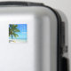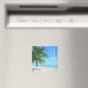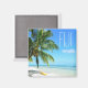 Imán de recuerdo cuadrado con un kayak amarillo bajo una palmera colgante en una playa de arena blanca en la isla tropical de Fiji, con el texto: 'Fiji'.