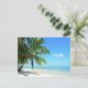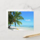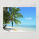 Postal de un kayak amarillo bajo una palmera colgante en una playa de arena blanca en la isla tropical de Moorea, cerca de Tahití, en el archipiélago del Pacífico Polinesia Francesa.
