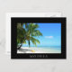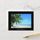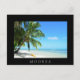 Postal de un kayak amarillo bajo una palmera colgante en una playa de arena blanca en la isla tropical de Moorea, cerca de Tahití, en el archipiélago del Pacífico Polinesia Francesa con un borde negro y el texto: "Moorea".