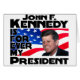 "John F. Kennedy es para siempre mi presidente" en un diseño audaz y patriótico que incluye el retrato del presidente respaldado por la bandera estadounidense.