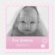 pegatina de personalizable con foto e información de nacimiento. Puntos de polka rosa y blanco