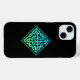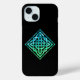 Un Funda de iPhone 15 de un diseño de diamante de nudo celta azul-verde contra un fondo negro.