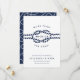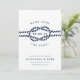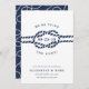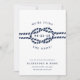 Anuncie a su boda a la familia y amigos con esta moda costera, salven las tarjetas de fecha en azul marino y blanco clásicos. El diseño presenta un ilustracion de cuerda nublada con su fecha boda en el centro, rodeado por "¡estamos atando el nudo!" Personalice estas naúticas guardar las tarjetas de fecha con sus nombres, fecha de boda, ubicación y sitio web del boda, o una indicación de que le seguirá una invitación formal. Las tarjetas cambian a un patrón de cuerda náutica en blanco sobre la marina.