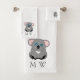 Bath towel set, consisting of a face cloth, hand towel and bath towel with a koala design. You can customise this bath towel set with any text of your choice. Should you require any help with customising then contact us through the message link on this page. Koala bear design bathroom towel set