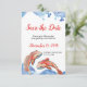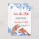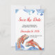 Una tarjeta única de Koi Fish Save The Date establecida en un paisaje oceánico...