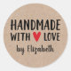 Un pegatina rústico personalizado "hecho a mano con amor" sobre un fondo de color kraft. Hazlo tuyo añadiendo tu propio nombre. Un toque de bonito para todos tus regalos hechos a mano. Diseñado para ti por Blackberry Boulevard.