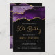 Esta elegante invitación a la fiesta de cumpleaños número 30 presenta una acuarela de un ágate gede en tonos violeta con falsos toques de purpurina de oro. Las palabras "Cumpleaños 30" aparecen en escritura moderna de color dorado. Personalizar con el nombre del honorario en un texto de color dorado y los detalles en blanco sobre un fondo negro. En el reverso aparece un diseño de agate morado y dorado a juego.