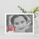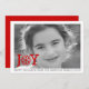 La alegría roja moderna de los Navidades mínimos de vacaciones tarjeta de foto plana que incluye una foto para bebé y la palabra "JOY" en rojo con un copo de nieve en lugar de la letra O y un borde blanco a su alrededor. Este elegante y contemporáneo diseño vacacional es una plantilla de personalizable.