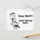 Esta graciosa postal muestra a un hombre con traje sentado en una silla. La tarjeta postal dice: "¡¿Qué edad tiene?! ¡Feliz cumpleaños otra vez!" El personaje de la tarjeta parece impactado con la boca abierta, el aleteo de su lengua y la sudoración nerviosa volando sobre él mientras vuela hacia atrás en su silla con ruedas. Esto hace una postal de cumpleaños maravillosa para cualquiera. Este gracioso dibujo lo hizo mi hijo David Mann.