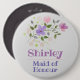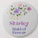 Presentamos la doncella de honor - un botón con el nombre y un ilustracion floral. Identificación del boda.