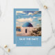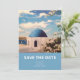Esta es una pintura acrílica a mano de Santorini Grecia para salvar la fecha. Con un fondo azul claro, este diseño moderno y sencillo es perfecto para una boda de destino en Grecia. Ideal para los amantes de la playa, las flores, el arte y la arquitectura. Personalizar y personalice la información de su boda.