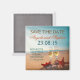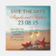Romántica playa salva los imanes de dátiles con una estrella de mar roja en la arena, conchas blancas, un barco de papel y dos lentes de champán brillantes. La foto fue tomada durante una hermosa puesta de sol en la playa cerca de las olas azules del mar, con una cámara fotográfica profesional y es muy nítida y limpia. Lo mejor para las bodas de playa en una isla tropical cerca del océano o del mar.