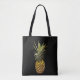 La esta bolsa de asas hermosa exhibe una piña marrón de oro madura, jugosa con las hojas espinosas del verde fijadas en un fondo negro.