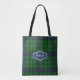 La bolsa de asas colorida de la tela escocesa hecha en el modelo azul, verde, rojo, blanco y negro tradicional del tartán de Duncan del clan. Una placa azul decorativa del texto, en el frente del bolso, tiene texto blanco de encargo listo para personalizar. Gran tote de uso múltiple.