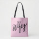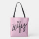 La mano bonita letra la bolsa de asas de WIFEY para las mujeres del recién casado. Diseño elegante de la tipografía de la escritura para ella. Accesorio con clase para apenas las mujeres casadas. Diseño moderno de la escritura de la caligrafía con el icono lindo del corazón. Ilustraciones hermosas de las letras de la mano del vintage hechas con amor. Ideas de moda del regalo de boda. Fondo del rosa en colores pastel o del color del personalizado. El doble echó a un lado impresión.