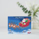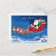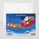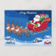 Una tarjeta postal navideña caprichosa que presenta a Santa Claus volando a través del cielo nocturno en su trineo rojo, lleno de regalos coloridos, mientras sus renos lideran el camino sobre un pueblo cubierto de nieve. Esta ilustración alegre y juguetona captura el espíritu de la Nochebuena, perfecta para enviar felicitaciones festivas a amigos y familiares.