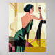 Poster en una elegante dama Art Deco / jazz en verde jade, sosteniendo una copa de vino, en un estilo de arte moderno semi-abstracto