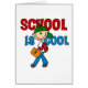 ¡Lindo de nuevo a la figura diseño del palillo de la escuela con una figura muchacho del palillo llevar una mochila y un texto rojo y azul colorido que lea la "escuela es fresco"!