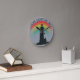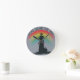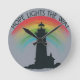 "Hope Lights the Way" tiene un faro y un arco iris. El faro es un símbolo de esperanza, y el arco iris es un recordatorio de que incluso en los tiempos más oscuros, siempre hay luz. El texto "Hope Lights the Way" está escrito en un tipo de letra cursiva en bucle alrededor de la cara del reloj. Las manos son negras y la cara del reloj en sí es blanca. El reloj de pared que me enviaste tiene un diseño de faro en el centro, con las palabras "Hope Lights The Way" escritas en círculo alrededor de él. Las manos del reloj son negras y la hora es de 3:15. El faro es blanco, con un techo rojo y ventanas negras. Hay un arco iris saliendo de la base del faro. Hope Lights the Way" escrito en un círculo alrededor del borde. En el centro del reloj hay un ilustracion de faro con un arco iris que sale de él. El faro es un símbolo de esperanza y guía, y el arco iris es un símbolo de promesa y nuevos comienzos. Las manos del reloj son negras y parecen estar hechas de metalizado.