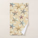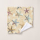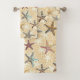 Starfish en el juego de toallas de baño de arena. Pescado estelar colorido de color rosa, azul, verde, gris, amarillo y marrón. El conjunto de esta moda costera destaca por su magnífica paleta de azul verde azulado, gris, amarillo y crema. El océano, la orilla del mar, la decoración de los cuartos de baño inspirada en la casa de playa.