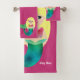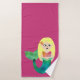 Sistema lindo personalizado de la toalla del cuarto de baño de los falsos del Relieve metalizado niños rubios de la sirena. Pequeña sirena adorable con la falsa cola del verde del efecto metalizado, las camisetas sin mangas rosadas y las estrellas de mar rosadas en su pelo rubio. Personalice con nombre en blanco en un fondo rosado brillante bonito en la toalla del cuerpo. www.SamAnnDesigns.com