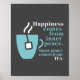 El arte mural divertido para los amantes del té incluye una silueta de tazas de té acuático con una frase graciosa que dice "La felicidad viene de la paz interior. La paz interior viene de TEA". Diseño acuático y blanco sobre fondo gris de carbón vegetal