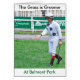 La hierba es más verde en el prado de Belmont. Una sonrisa y las sedas blancas que llevan felices de "Juan Velasquez" del jinete con los puntos negros, entra en el pasto verde de esta pista histórica en Elmont, NY mientras que él señala hacia esta hierba verde deliciosa. El fondo muestra la señalización verde icónica que rodea la verja blanca del prado.