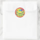 "Cure ignorancia, no autismo" en texto azul debajo de una cinta infinita de espectro de arco iris en un óvalo amarillo enmarcado por naranja y rojo.