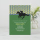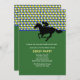 Una invitación deportiva perfecta para un fiesta de Kentucky Derby o cualquier ocasión relacionada con carreras de caballos. La carta presenta un patrón de argyle azul, verde y blanco en la parte superior, un fondo verde sólido y un jinete de silueta en un caballo de negro.La invitación es fácil de personalizar con su redacción, fuente, color de fuente y elección de seis tipos de papel.