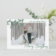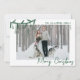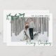 Envíe alegría de vacaciones con esta tarjeta horizontal de Navidades planos. La parte delantera resalta una gran foto sobre un fondo blanco y nítido, acentuada con una franja verde de doodle de pino verde y adornos colgados en la esquina superior izquierda, superponiendo ligeramente la imagen para un aspecto casual dibujado a mano. La parte superior derecha tiene espacio para sus nombres o apellidos y el año en una simple letra verde escrita a mano, mientras que la parte inferior derecha muestra "Feliz Navidad" en un estilo de caligrafía de escritura verde. En la parte trasera, hay espacio para añadir una nota de vacaciones y firmar con los nombres de tu familia, o puedes dejarla en blanco para escribir a mano un mensaje personal para un toque más sincero. Disponible como tarjeta impresa o archivo digital, lo que facilita el envío por correo, el uso compartido en línea o la impresión local.