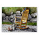 Una mecedora de la madera de pino con un strawhat adornado con el pañuelo azul colorido que cuelga en el respaldo. En la tierra en el adoquín empiedra una regadera oxidada y algunos plantadores de la terracota. El fondo se llena de una pared hecha de cantos rodados y de porciones naturales de hierba agradable, verde. Una acuarela pacífica, escénica.