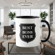 La mejor taza de café del jefe nunca. Taza fresca para el jefe más grande de los mundos. Logotipo del aprecio del día de Boss. Emblema blanco y negro del escudo con cita personalizable.