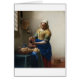 La Milkmaid de Johannes Vermeer, aceite sobre lienzo c. 1658, representa a una criada doméstica vertiendo leche de una jarra en una de las composiciones más logradas del artista de colores claros y sutiles, contrastantes y enigmáticos retratos de la figura humana. Antes de la criada hay una vida quieta de diferentes tipos de pan con un mantel azul. La luz natural juega sobre el interior y refleja figuras y objetos. El deslumbrante azul muestra el lujoso uso de pigmentos caros de Vermeer, como ultramarina natural, lapis lazuli. Johannes (Jan) Vermeer (1632 - 1675) fue un maestro holandés pintor de escenas de género interior cuyas obras fueron redescubiertas en el siglo XIX. En composiciones geométricas cuidadosamente construidas, trazadas en una meticulosa perspectiva lineal, Vermeer exploró los efectos de la luz y el color en figuras humanas, objetos y texturas en habitaciones domesticas, construyendo sobre los descubrimientos ópticos y la profundidad espectival 3D de Leonardo y el Renacimiento. Tanto un pintor como un comerciante de arte, Vermeer lentamente produjo algunas de sus laboriosamente ejecutadas composiciones ricamente pigmentadas por año, viviendo enteramente en su ciudad natal de Delft, evitando la fama de sus contemporáneos cercanos Rubens y Rembrandt que logró finalmente en la era moderna.