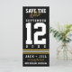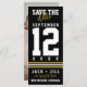 Moderna foto de Boda deportivo de oro negro salva la diversión de la fecha, negro moderno y creativo, dorado y blanco salvan la tarjeta de fecha con toda la foto en la parte de atrás. Diseñado para la pareja moderna que ama los deportes y quiere celebrar su día incorporando los colores de su equipo favorito en la papelería boda. ¡Hurra sobre tu boda! Todos los elementos de diseño son personalizables para que usted se ajuste a sus colores favoritos.