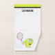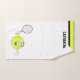Toalla de mano del sudor del jugador de tenis hecha en blanco con una banda amarilla y negra, en un extremo y una pelota de tenis divertida del dibujo animado, en el otro extremo de la toalla. El texto negro está listo para personalizar para leer lo que usted quiere.