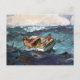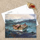 Postal de arte fino con la pintura, The Gulf Stream (1899), del artista estadounidense del movimiento de realismo Winslow Homer (1836-1910). Una capa marina en el Caribe con tiburones nadando en el agua que rodea a un hombre luchando contra las olas en un bote de pesca.